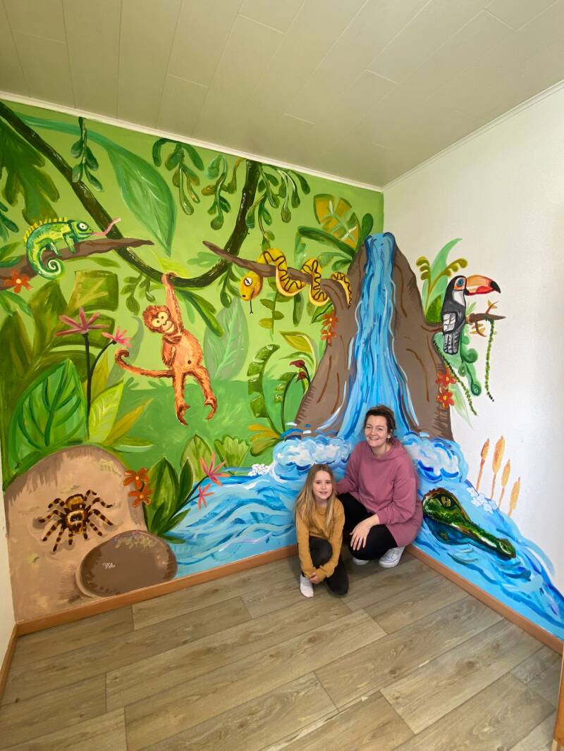 Wekelijks, op woensdagnamiddag hadden Yfke en ik ons privé lesje. We werkten samen van ontwerp tot uitvoering aan haar eerste muurschildering. Het was een geweldige leerschool zowel voor mezelf als voor Yfke. Ik gaf heel wat nuttige tips en leerde haar meer over de beeldaspecten waar je rekening mee moet houden. Na een 15 tal lesjes (60 a 90min) kon ze haar eerste muurschildering eindelijk handtekenen.